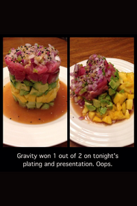 So for an actual recipe, today I chose Ahi Tuna Stacks With Soy Ginger Dressing. It’s fresh and light. And it can be fancy or not. They say presentation is everything when it comes to meals, but as you see from my photo, perfection doesn’t always happen.