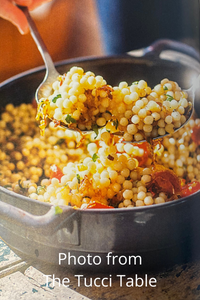 During the height of COVID, finding Israeli couscous (it’s the fat, pearl-sized couscous), so I’ve substituted orzo, and it’s equally as good.