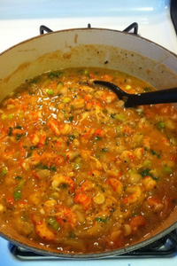 Some of you may know that I can’t eat bell peppers because they trigger migraines for me. So I increase the amount of celery and onion to make up for the absent bell peppers. I am not a “pinch the head, suck the tail” crawfish person, so I use frozen tail meat. And don’t be scared to make a roux – this cookbook has easy-to-follow instructions. For this recipe, once the roux is the color of peanut butter (I hold the peanut butter jar next to it to make sure), you’re ready for the next steps. Laissez les bons temps rouler!